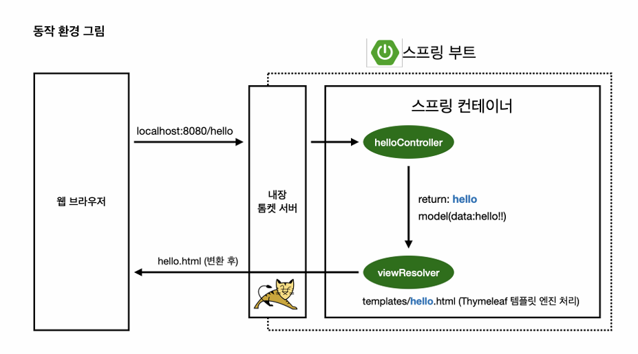 | ② 내장 톰캣 서버 처리 | 스프링 부트의 내장 톰캣 서버가 요청을 받고 URL 요청을 스프링에게 넘긴다. |
